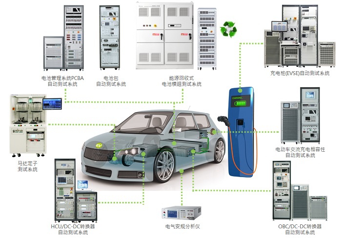 Chroma提供了可编程交流电源、可编程直流电源、可编程直流电子负载、可编程交流电子负载、功率分析仪、安规测试仪,电源自动测试系统等产品,电源和负载的额定功率从几百瓦到几百千瓦,可用于测试电动车汽/混合动力汽车相关零部件和设备。