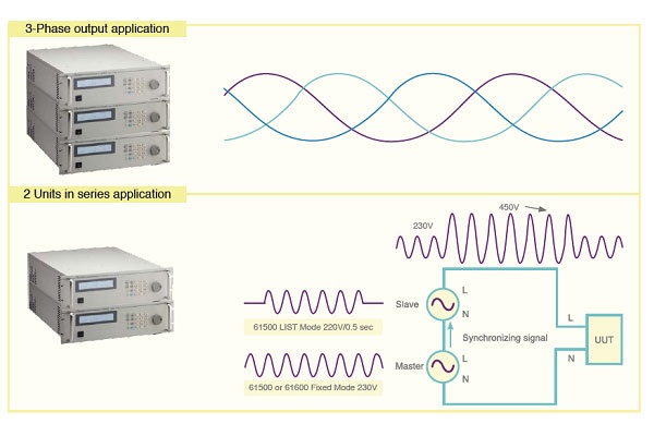 Chroma 61501可编程交流电源可以使用三台, 在三相模式的同步机制下, 串联成三相电输出使用. 或使用两台做高压(300V-600V)输出应用, 搭配LIST模式可进行瞬间高压450V/0.5秒的测试, 如图.