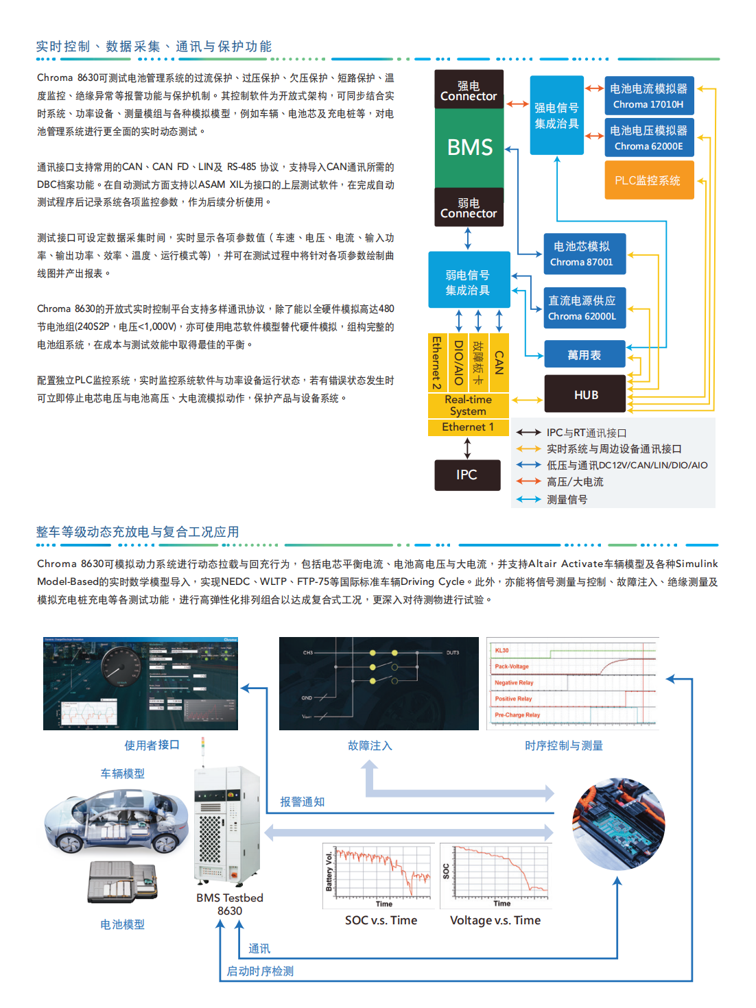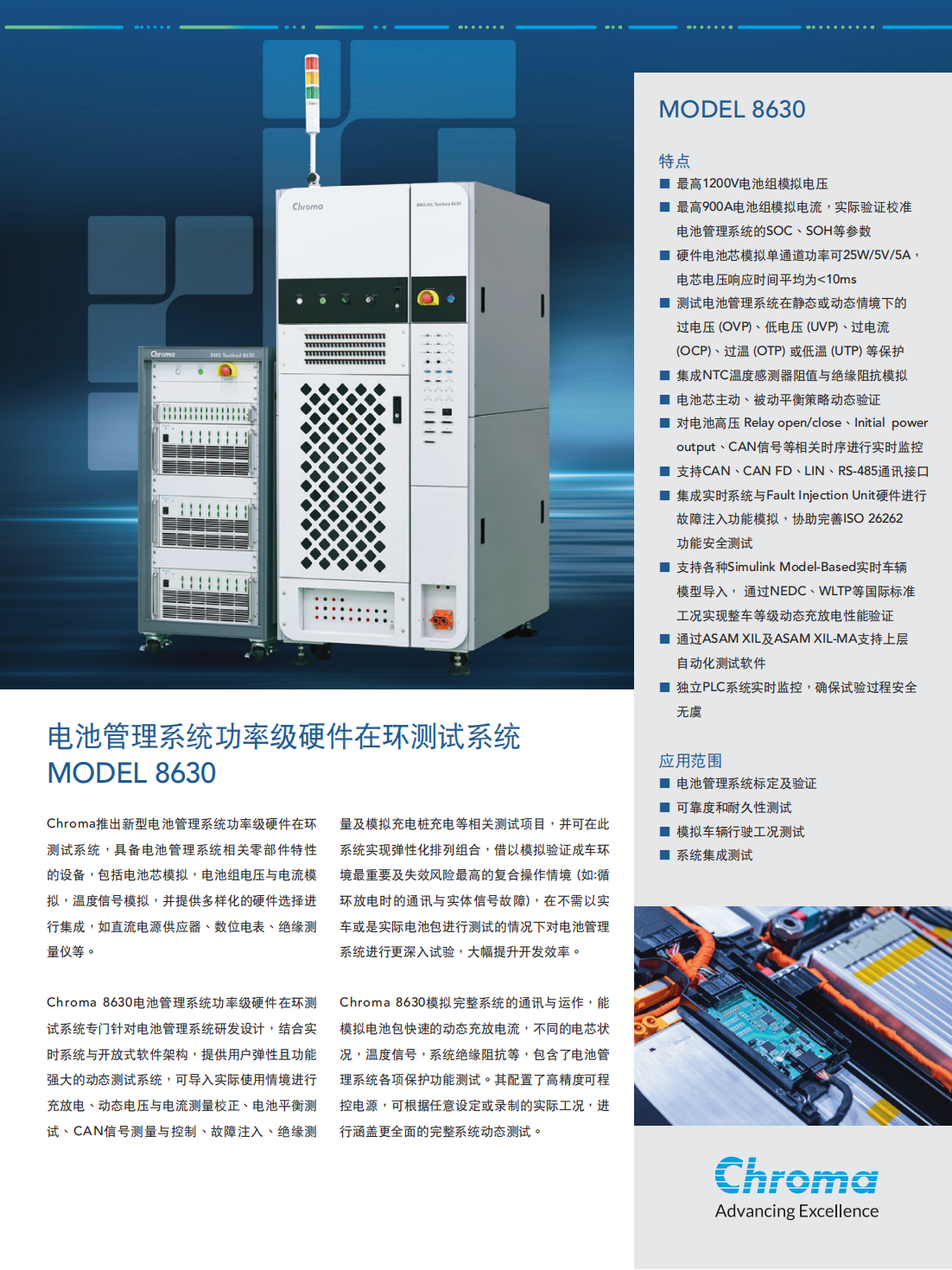 Chroma推出新型电池管理系统功率级硬件在环测试系统,具备电池管理系统相关零部件特性的设备,包括电池芯模拟,电池组电压与电流模拟,温度信号模拟,并提供多样化的硬件选择进行集成,如直流电源供应器、数位电表、绝缘测量仪等。