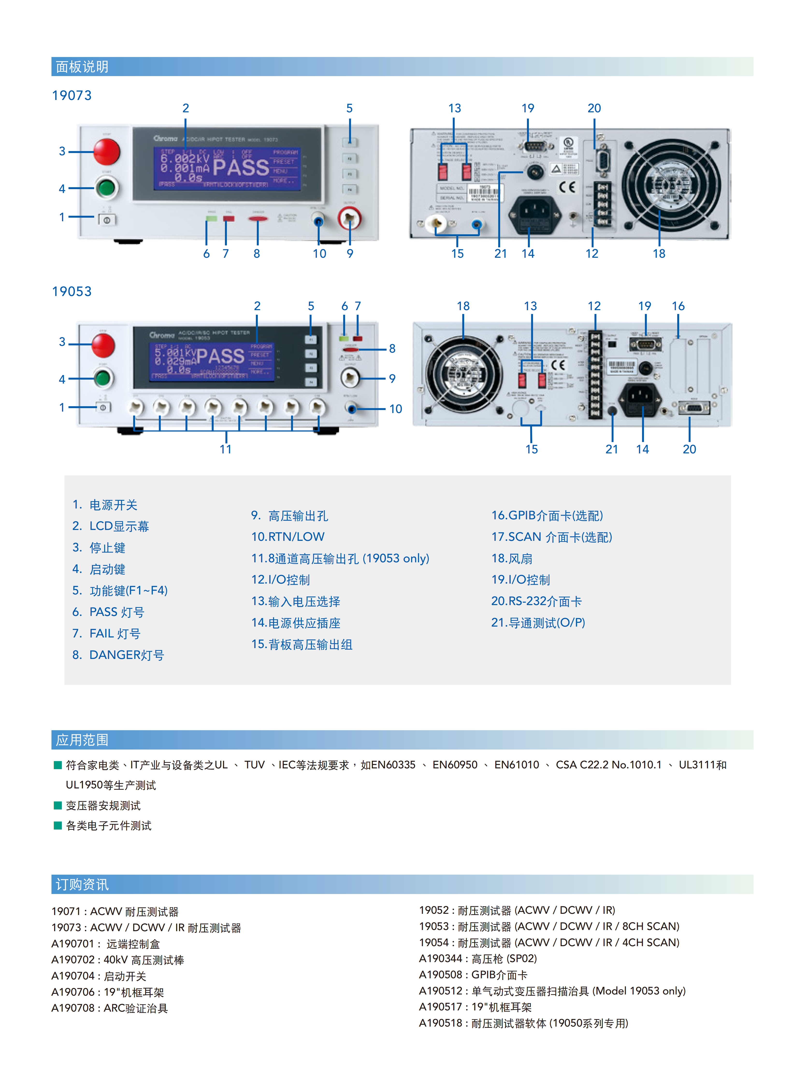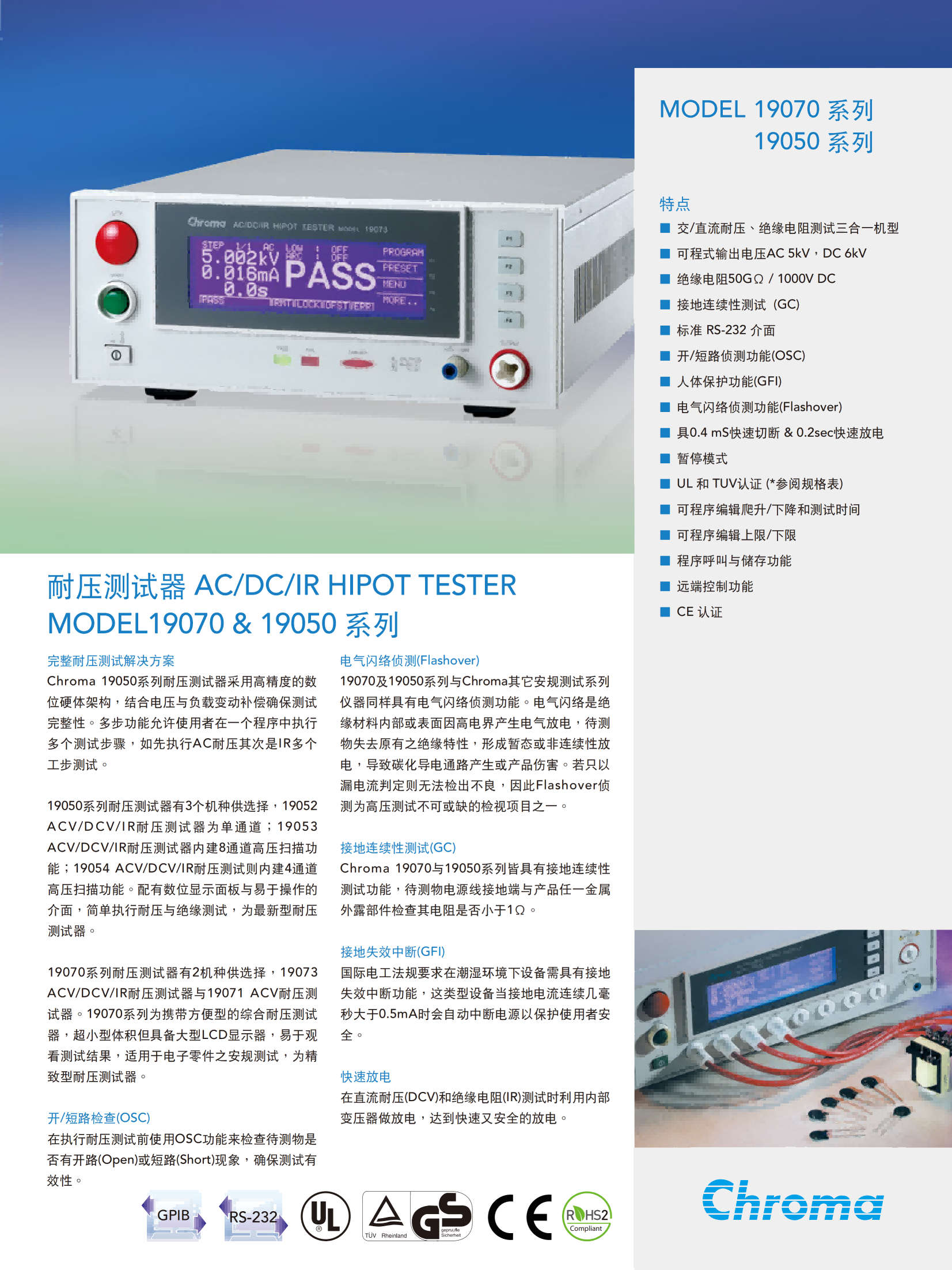 Chroma 19050系列耐压测试器采用高精度的数位硬体架构,结合电压与负载变动补偿确保测试完整性。