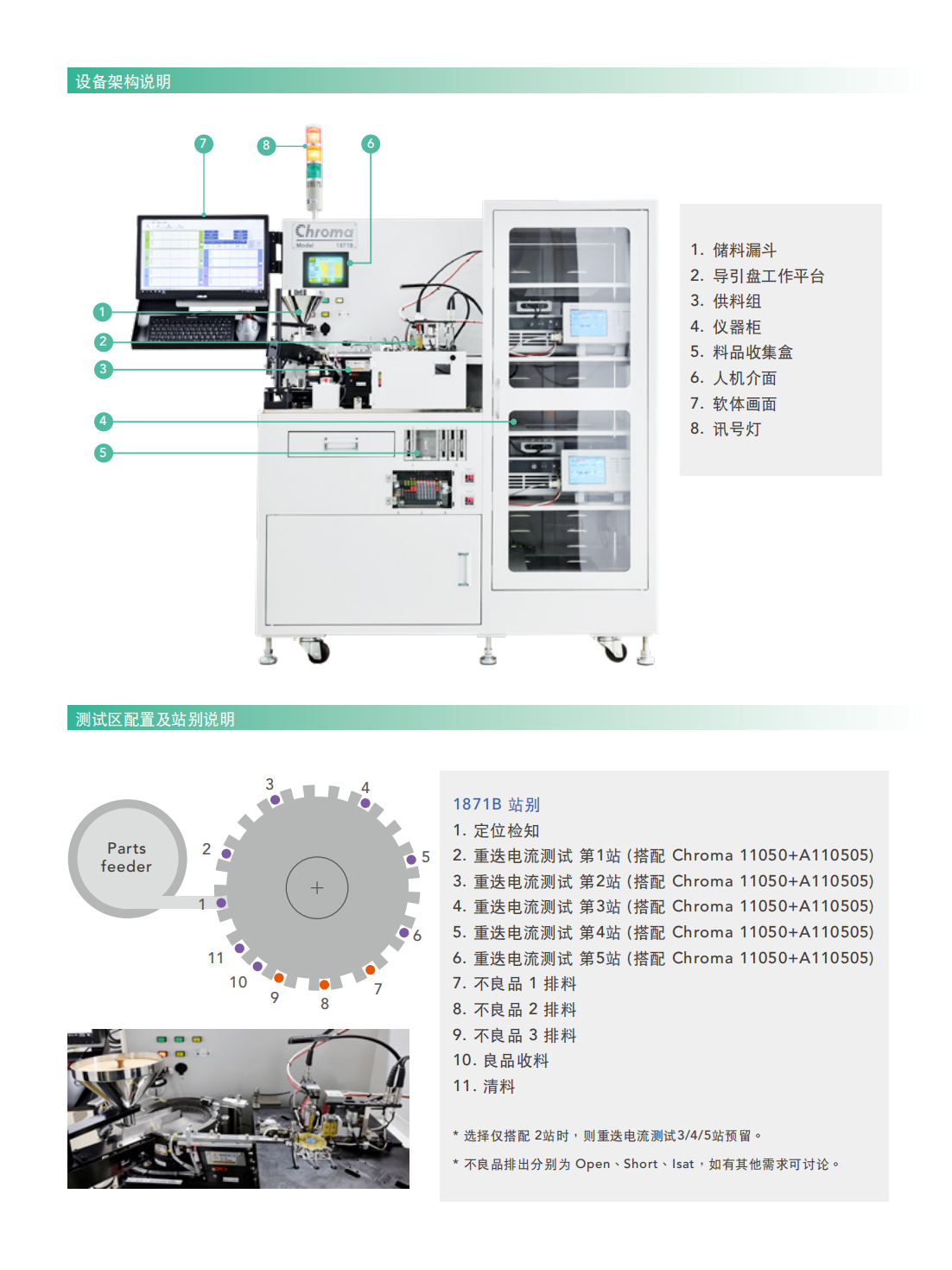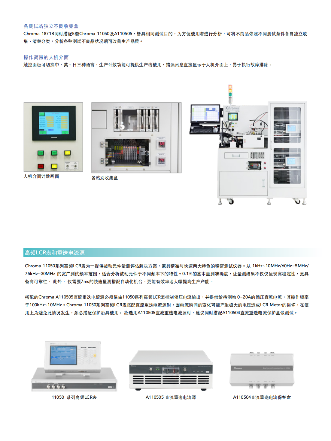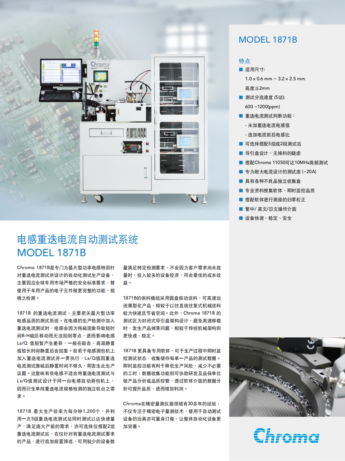 Chroma 1871B是专门为晶片型功率电感特别针对重迭电流测试所设计的自动化测试生产设备,主要因应全球车用市场严格的安全标准要求,替使用于车用产品的电子元件做更完整的功能、规格之检测。